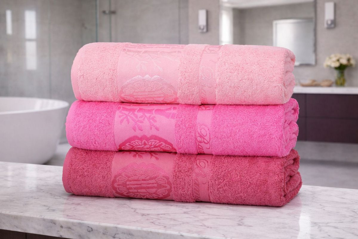 Набор турецких бамбуковых махровых полотенец Zeron 3 штуки 15858 Damkas Desen Bamboo розовый 50х90