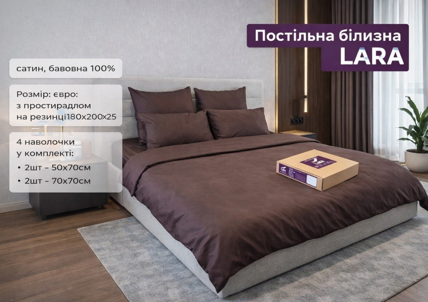 Постільна білизна LARA сатин LUX однотонна євро з простирадлом на резинці 160х200х25 d13260e160 BROWN 4 наволочки в комплекті